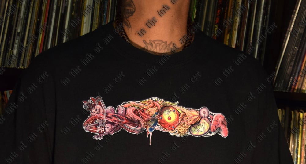 The front artwork is the "Dystopia" piece only, drawn by our friend Roberto (without the "Circle of Life Is Abuse" underneath it). We only made a few of these the first run! The lower back is a "Dystopia" Wildstyle outline drawn by Dino